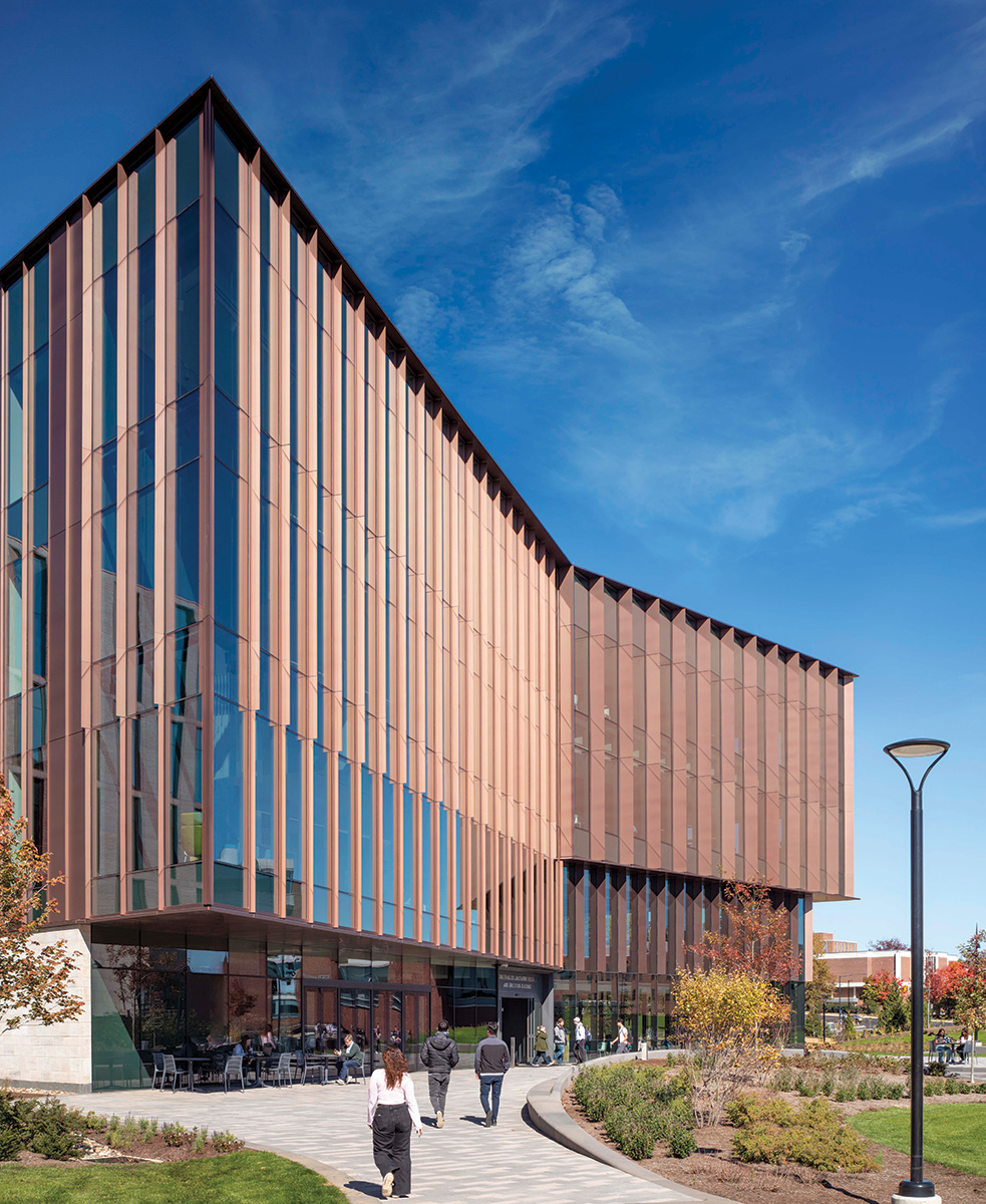Scaife Hall replaces an earlier structure of the same name, designed by Altenhof & Brown and completed in 1962, which featured an attached sculptural auditorium wittily dubbed the “potato chip” for its saddle-shaped roof. “It was really tight, with crammed rooms that weren’t feasible to renovate,” says KieranTimberlake principal Brendan Miller.