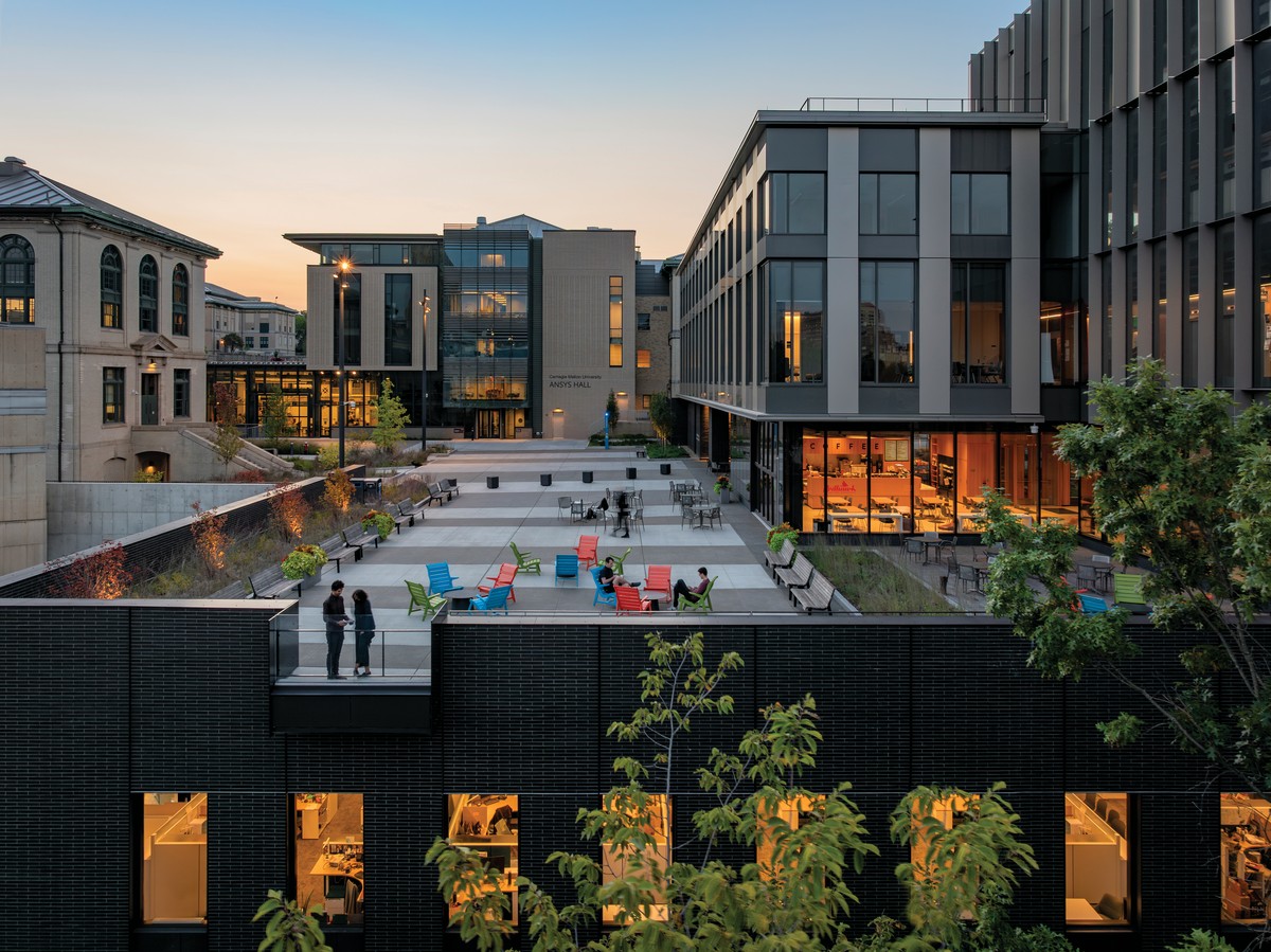The configuration, says Miller, also forms a hardscaped quad (with great views of the University of Pittsburgh’s Cathedral of Learning) between Scaife and neighboring Hamerschlag, Roberts, ANSYS, and Baker-Porter halls—which together comprise the nucleus of engineering facilities. The quad is programmed with a café, housed in Scaife. “Students spend a lot of time here, and having that amenity allows them to really make it their own,” says Miller. Click here to continue...