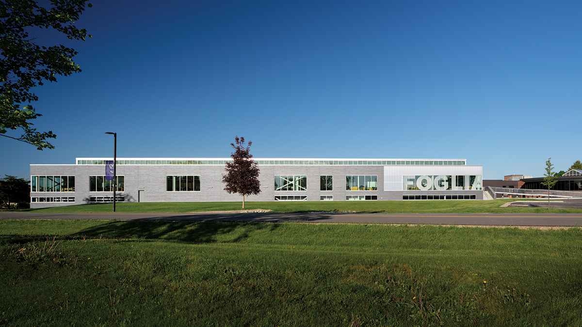 The new 48,000-square-foot facility is named after local manufacturers and philanthropists Vince and Pat Foglia. Located at the southeastern edge of MCC’s campus, it’s flanked by an access road and parking lots. It was not a promising site, but Ross Barney and her team made it work by integrating their project cohesively with existing buildings. They inserted a bar—an elongated rectangular volume—parallel to an adjacent bar of automotive shops to the west. The void between them functions as a service drive. To the east is a landscaped stormwater-infiltration basin.