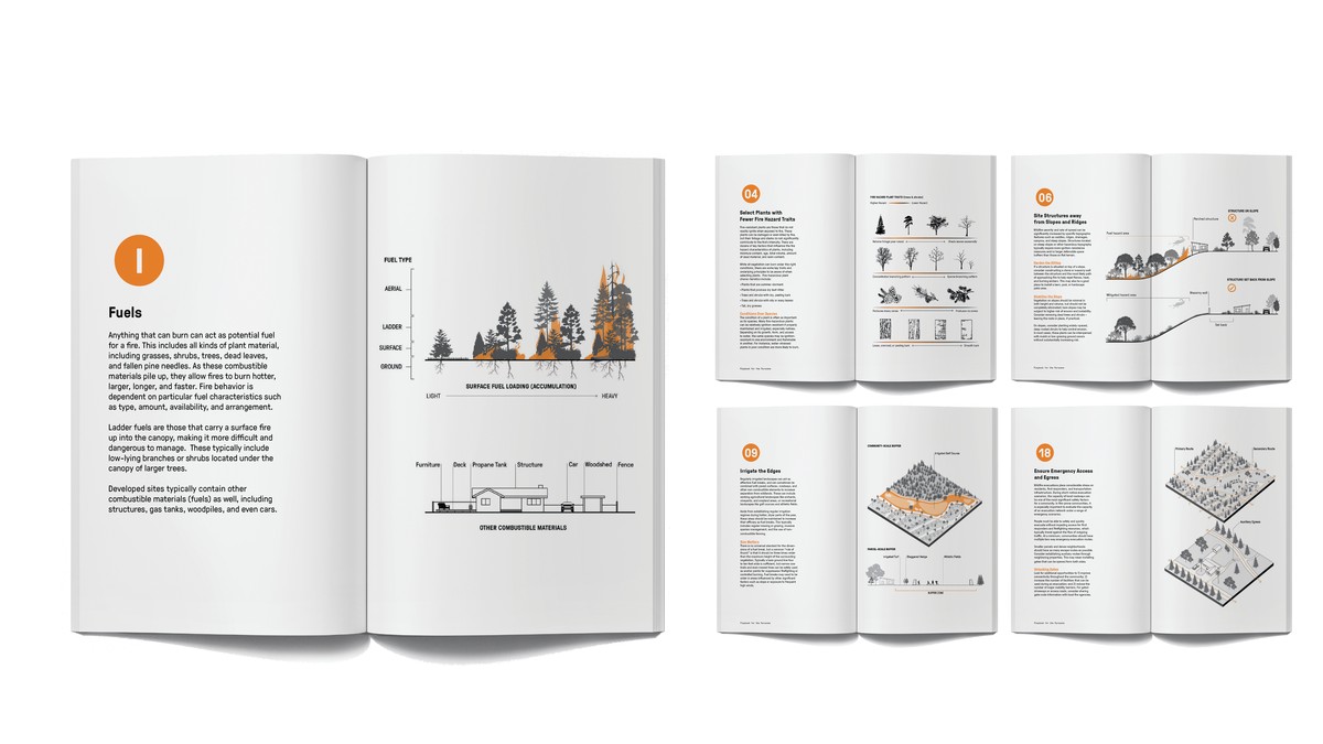 We didn’t formally start working on it until early 2022. But there had been a growing realization across the firm that we needed to better understand wildfire dynamics and best practices for landscape planning and design. That began a couple of years earlier, after the Glass Fire in 2020, which scorched a number of buildings and forested areas on two ongoing SWA projects in Sonoma and Napa counties. Our offices had been working with those clients for many years before that fire really changed our remit. Coincidentally, right around the time of the Glass Fire, a group of us in our Sausalito studio were working on fire-related research in and around Paradise, California, which had been almost entirely destroyed during the 2018 Camp Fire. It is important to also point out, with four studios in the state, SWA has been working in fire-prone landscapes for decades.