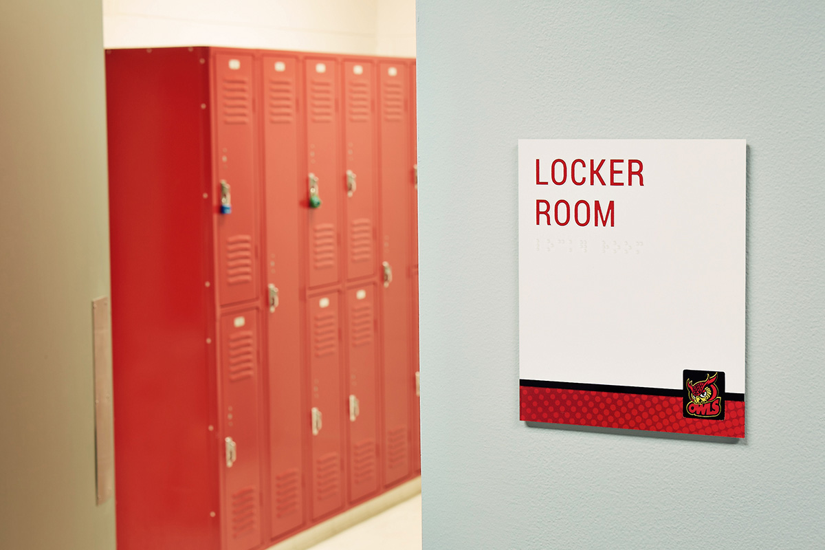 With raised Braille and good contrast between the clear red text and the white background, the signage at this locker room meets accessibility requirements while integrating the school’s colors and mascot.