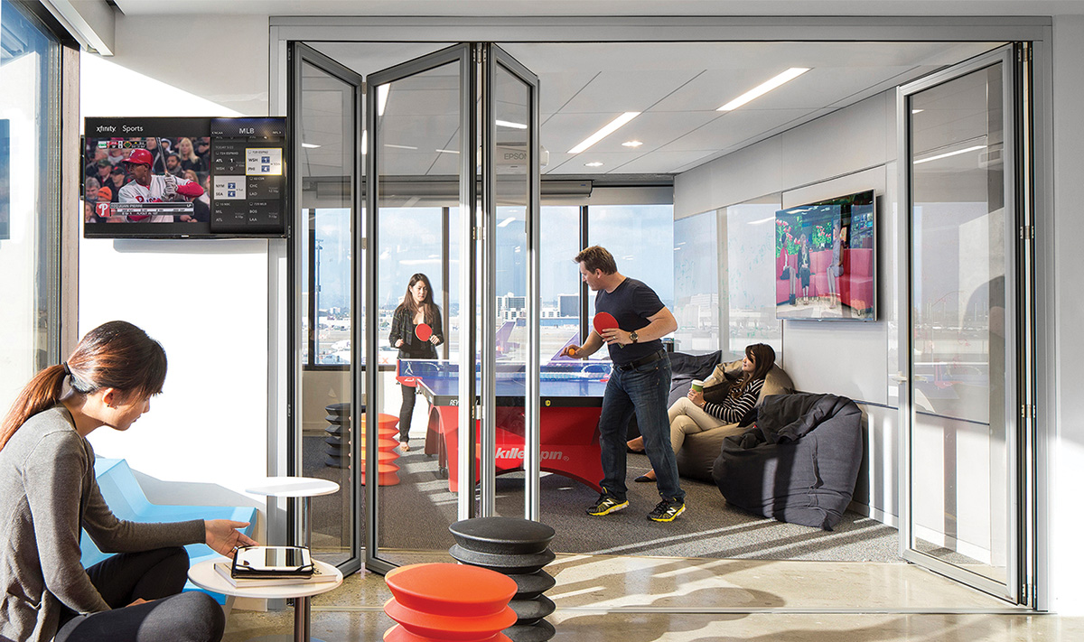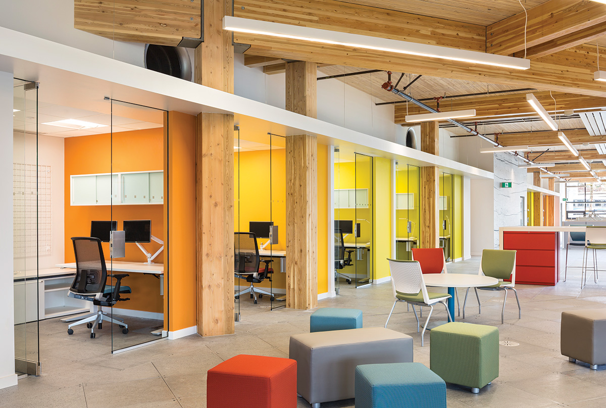 The positive psychological impacts of more natural light capture significant benefits for the overall well-being of occupants. Surveys demonstrate that most office workers would like direct sunlight in their offices at least one season of the year14 and that they believe working under natural daylight is better for their health and well-being than electric lighting.15 Using glass partitions allows workers to enjoy distant, diverse, and dynamic views from the interior and establishes a link to the surrounding environment, which fosters connection and creativity.16 Collaboration and interaction are increased with a visual connection to coworkers and peers. By minimizing obstructions, glass partitions excel in allowing natural daylight from exterior-facing windows to diffuse through the interior spaces of an office. With documented research dating back to 1986, daylighting also has consistently been associated with improved mood, enhanced morale, less fatigue, and reduced eyestrain.17 Bright lighting enables enhanced focus and alertness, and well-daylit spaces are generally perceived by occupants to be “better” than dim, gloomy ones.18 National Institutes of Health (NIH) research19 into the impact of windows and daylight exposure on the health and sleep of office workers found that both natural and artificial bright light, particularly in the morning, can significantly improve health outcomes such as depression, agitation, sleep, balance circadian rest and activity, and seasonal affective disorder.