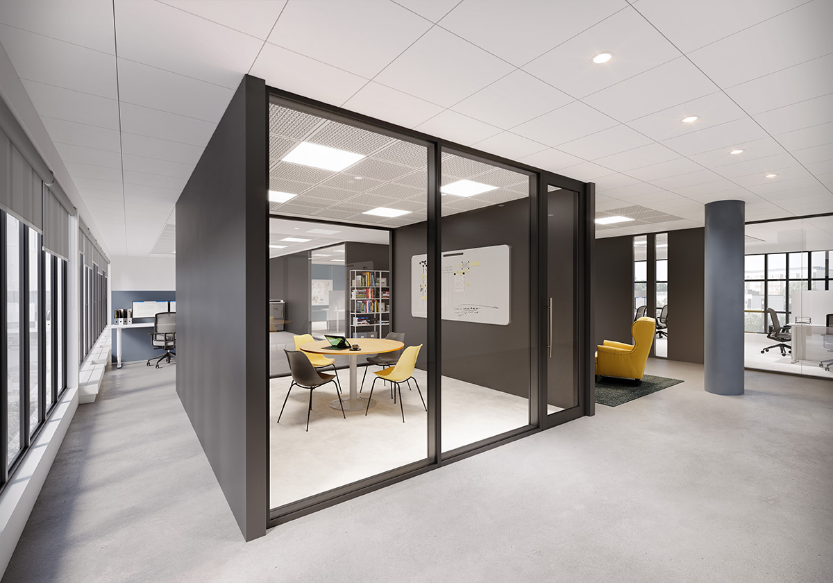 Freestanding glazed partitions define spaces with maximum transparency and are ideal for highly modular, remodeling, or tenant applications.