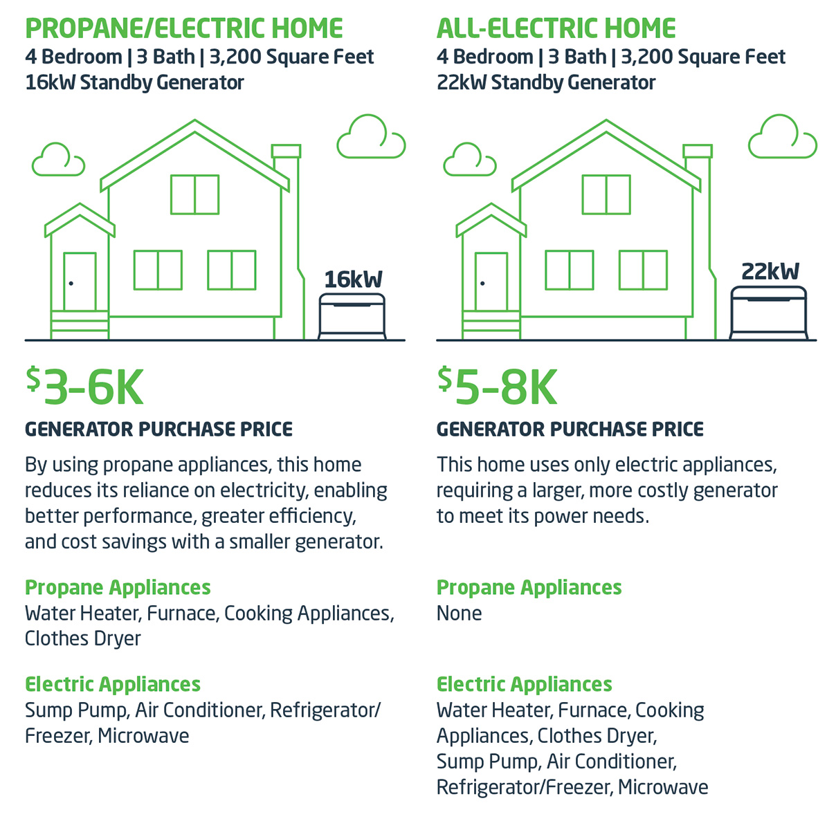 In the second scenario, none of the appliances run on propane, and all run on electricity. That means when a grid failure occurs, the home’s outsized electric load requires a 22-kilowatt generator to run the water heater, furnace, cooking appliances, clothes dryer, sump pump, air conditioner, refrigerator, and microwave oven.