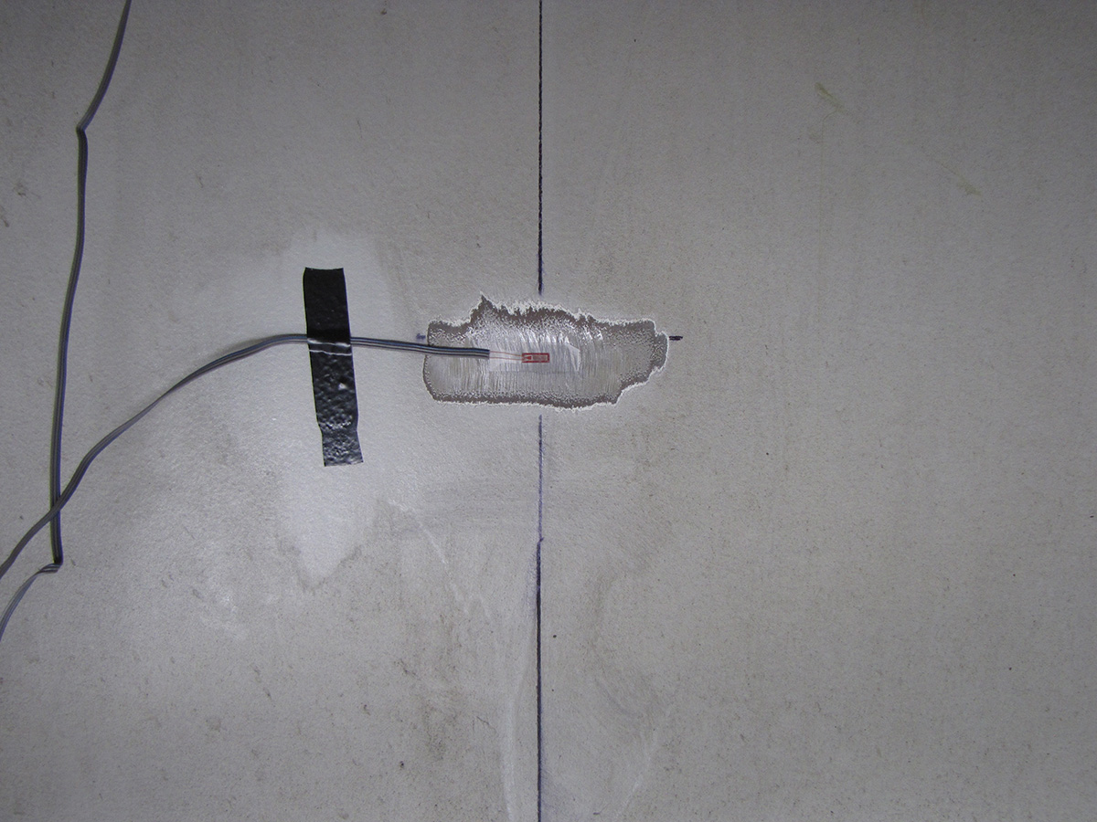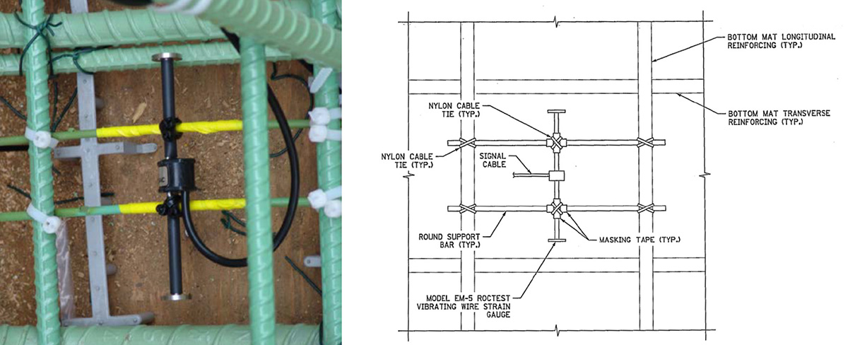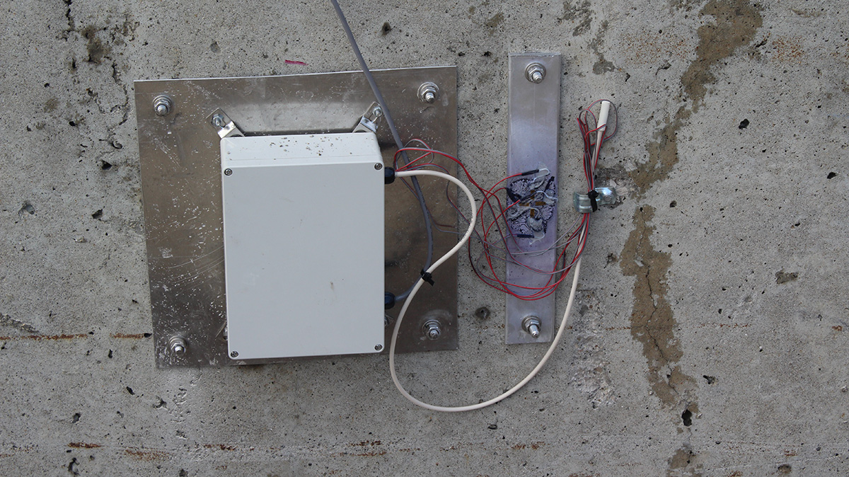 Wireless sensor node (left) and long-gauge strain sensor with thermocouple to measure flexural strain on Interstate 696 retaining wall in southeast Michigan.
