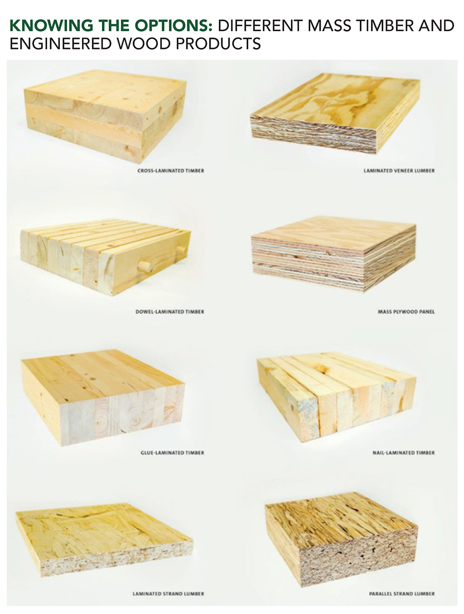 Products in the mass timber family include cross-laminated timber (CLT), dowel-laminated timber (DLT), glued-laminated timber (glulam), laminated strand lumber (LSL), laminated veneer lumber (LVL), mass plywood panel (MPP), nail-laminated timber (NLT or nail- lam), and timber-concrete composites (TCC). Mass timber and engineered wood products can be used in an array of applications.