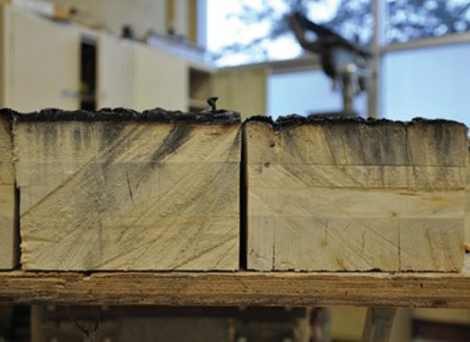 TAKE THE HEAT: There is an inherent fire resistance to heavy or mass timber, such as CLT shown here, because of the layer of char that occurs during a fire that protects the inner structure of the beam or panel.