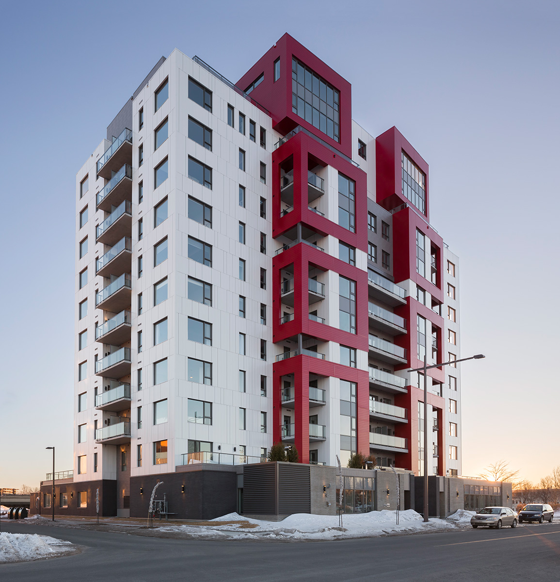 Project: Origine54. Mass timber’s lighter weight boosted this Quebec-based multifamily project—dubbed Origine—by seven additional stories, giving it a total of thirteen. The same building in that location made from concrete would have maxed out at six stories high, given the low bearing capacity of the soil. The architect for Origine is Yvan Blouin Architect.