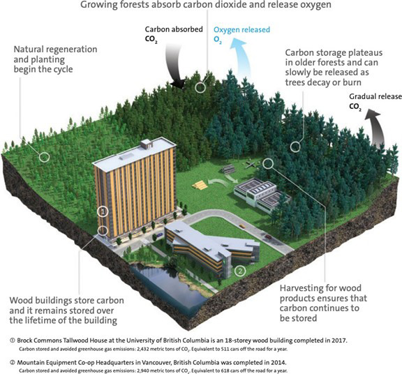 Martin advocates building with timber to reduce the carbon footprint. Timber is not only a renewable resource—it also does not need to be imported and is itself able to reduce carbon emissions. As a renewable resource, wood requires photosynthesis rather than machinery to develop and produce itself. Because trees grow across North America, there is also no need to import timber, which not only saves on shipping costs but also removes the pollution and energy associated with shipping. Finally, one study estimates that using wood as a building material could save “4 to 31 percent of global CO2 emissions and 12 to 19 percent of global FF [fossil fuel] consumption by using 34 to 100 percent of the world’s sustainable wood growth.”