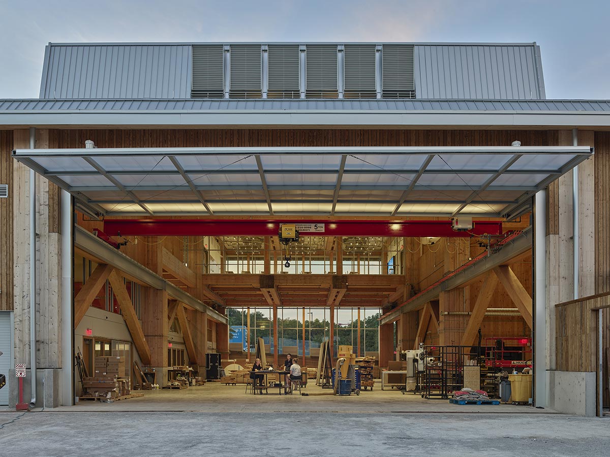 The building stands out from its semi-suburban landscape of strip malls and fast-food restaurants, sitting incongruously across five lanes of traffic from a Walmart and its sea of parking. Within a wood rainscreen and behind a glazed front facade, a set of programs, including an auditorium, studios and adjacent crit spaces, and seminar rooms are stacked. And, from the top of the resulting four-story tower, an irregular saw-tooth roof, integrating both north- and south-facing skylights, dramatically rises and descends to shelter the centerpiece of the building: an 11,000-square-foot high-bay fabrication shop that stretches 140 feet from the street to a rear outdoor-fabrication yard. Throughout, but especially here in the fabrication shop—a four-bay space that reaches nearly 80 feet high and is defined by chevron braces and eight beefy columns and substantial cross-laminated timber (CLT) walls and roof planes—the expressive potential of timber is on full display. With a five-ton gantry crane overhead, the rugged workshop feels as though it is a hybrid of a factory floor, an Ozark barn, and a cathedral.
