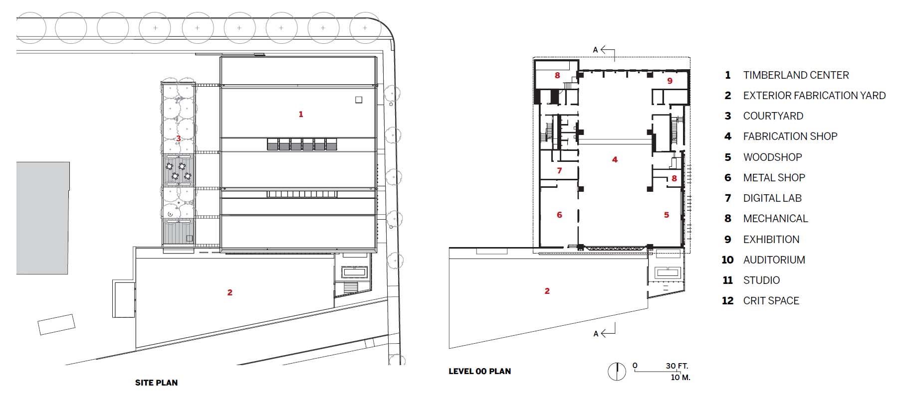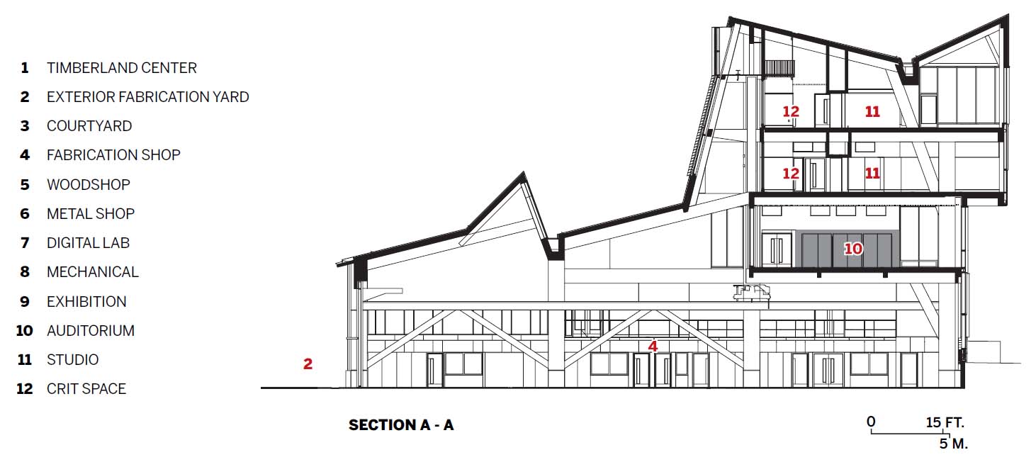 One of the most engaging aspects of the building is its sectional complexity, a hallmark of Grafton’s work. This quality is best illustrated by an atrium, where the layered program elements meet the workshop. Here, a glass interior wall (with a special acoustically insulated triple-glazed system at the auditorium) allows the stacked spaces to “borrow” daylight from a skylight and provides a direct view of the fabrication activities below. The configuration also permits the workshop to be naturally ventilated through dampers located near the top of the atrium and via the stack effect, without the need for a traditional cooling system (the space is heated in the winter).