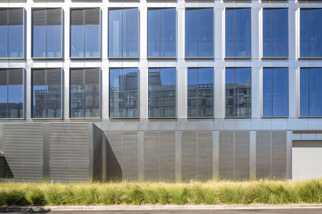The visual screening function of louvers and mechanical enclosures, as well as grilles, screen walls, and vegetative berms, can reduce the perceived industrial scale of data center infrastructure. Integrated with architectural cladding or branding elements, these elements help facilities present a refined, purpose-built appearance that suggests a more integrated visual structure. Louvers can be used as design elements, even if they are not functional. For instance, installing a series of louvers horizontally where only one or a few are incorporated into the mechanical system can create an architectural element of consistency and style.
