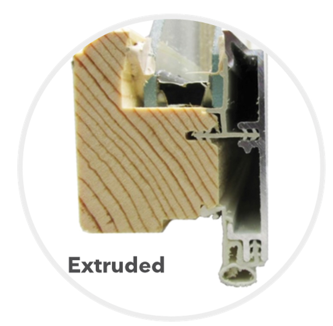 Aluminum cladding of windows and doors gained popularity in the 1960’s and has evolved since that time. Wood frames can be clad with aluminum, which is generally achieved in two ways. The original approach was to clad wood with roll-formed aluminum cladding that was quite thin (like flashing) and provided a protective shell tight to the wood frame piece. The more effective approach now involves an outer layer of extruded aluminum that provides many advantages over its predecessor. It is somewhat unfortunate that these are both categorized as “aluminum clad wood,” as the contemporary version is far superior and deserves a unique name—extruded aluminum clad wood. The extruded aluminum portion of the frame can provide a number of sectional profiles to enhance both traditional and modern designs and has sharp edges that provide crisp shadow lines and tight joints. This ability to customize the profile for a specific project provides the Architect with design flexibility.  Custom profiles can be selected to align with historic profiles, making the frame material a good choice when replacing windows in older buildings. With contemporary coating technologies, the range of color choices is endless, and the durability is exceptional (30-50 years). With a separate extruded aluminum shell that is structurally bonded to a wood frame, they act as a composite assembly that results in greater strength, enhanced resistance to moisture damage and rot, as well as improved thermal performance than either could achieve alone.
