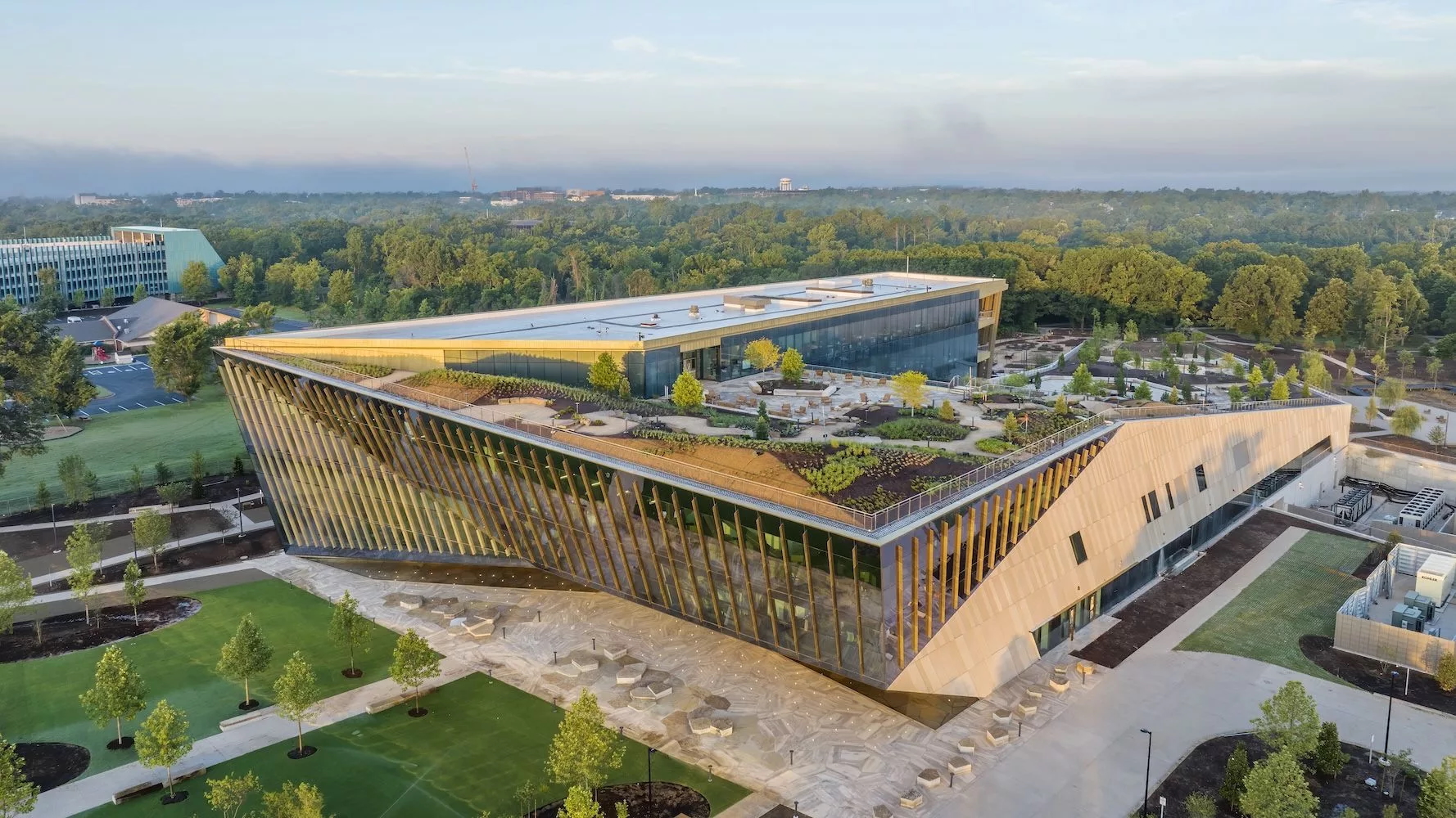 Designed as an expansion of the surrounding landscape, a multilevel public park tops the new Alice L. Walton School of Medicine, located on the campus of the Crystal Bridges Museum of American Art in Bentonville, Arkansas.