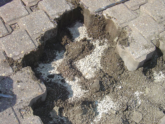 This profile of a clogged paver demonstrates sediment travel path and principle of an infiltration trench that collects pollutants and improves water quality.
