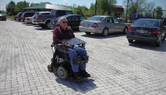 • Pedestrian Friendly. Permeable paver surfaces are pedestrian friendly and will meet or exceed ADA requirements. The ADA requires that openings in horizontal pedestrian traffic areas cannot exceed 13mm (½ inch) and must not have any lippage greater than ¼ inch. Elevation changes greater than ½ inch must have a ramp. Permeable pavers with 2mm chamfers will provide a smooth surface especially for wheelchair users. Handicap delineation as well as parking lanes and other markings may be more permanently constructed with the use of different colored pavers or engraved logos.