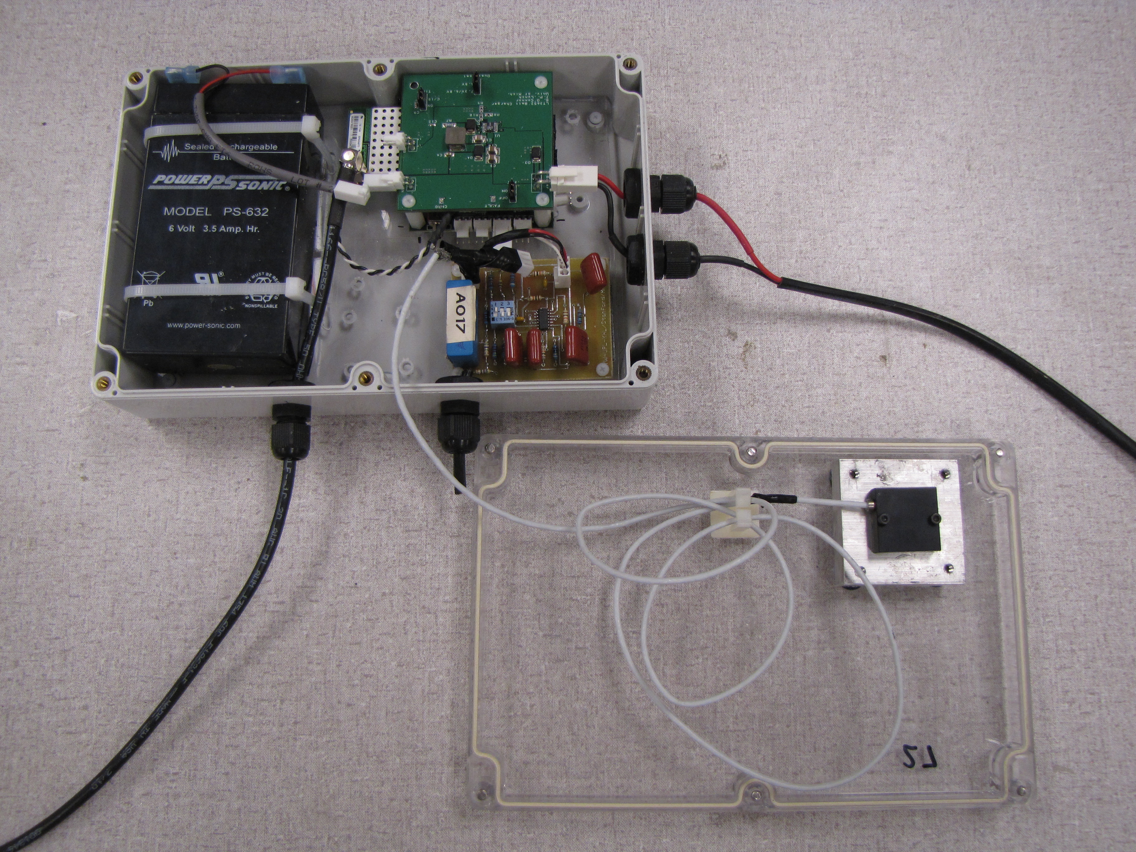 Wireless sensor node (left) and long-gauge strain sensor with thermocouple to measure flexural strain on Interstate 696 retaining wall in southeast Michigan.