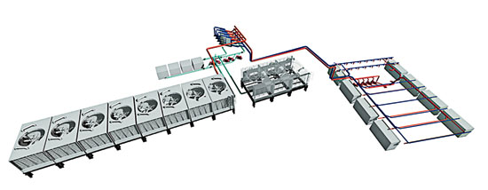 Servers at NREL’s highly efficient data center will be cooled year-round with water maintained at 75 °F by cooling towers. Waste heat from servers will condition both offices and lab spaces. Mechanical system designed by Integral Group.