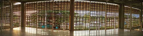 For many of the library's reading, media, and meeting rooms, this lattice of sticklike pieces of pine is all that separates the interior from the exterior. Unlike Bogotá, whose mountainous terrain has a cool climate, the flat landscape surrounding Villanueva features an almost tropical one. Enclosed spaces include restrooms and a ground-floor theater, which is the only room that uses mechanical cooling.