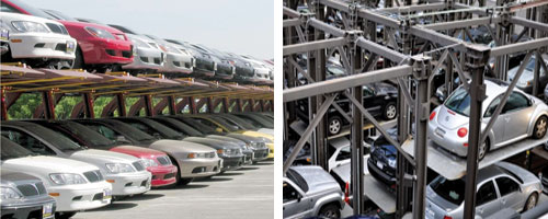 Left: Cantilever or “stacker” systems use hydraulics to park one car over another. These mechanisms require a trained valet driver to operate safely. Right: Four-post stackers use hydraulics to store up to five cars on top of each other. These mechanisms require a trained valet driver to operate safely.