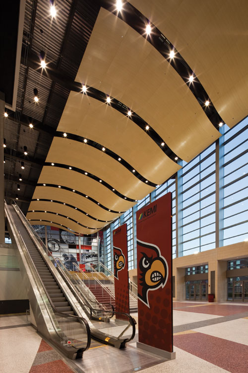 A film-on-metal ceiling system provides the look of maple veneer at Louisville, Kentucky's